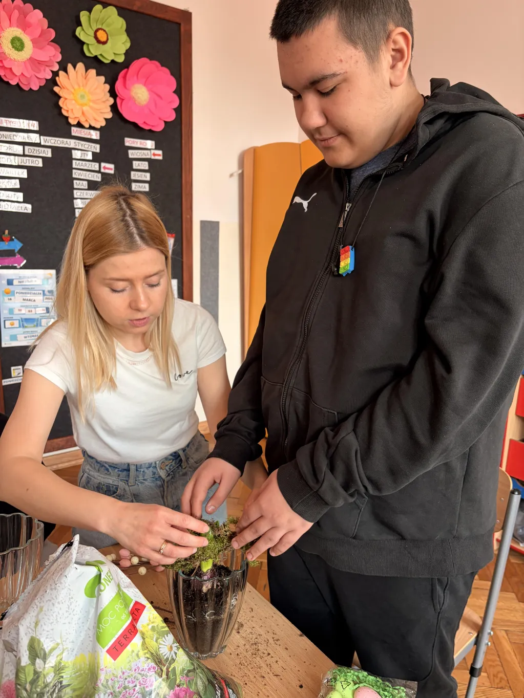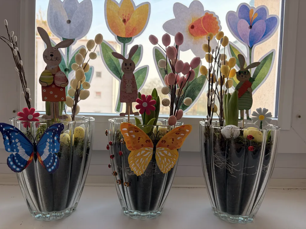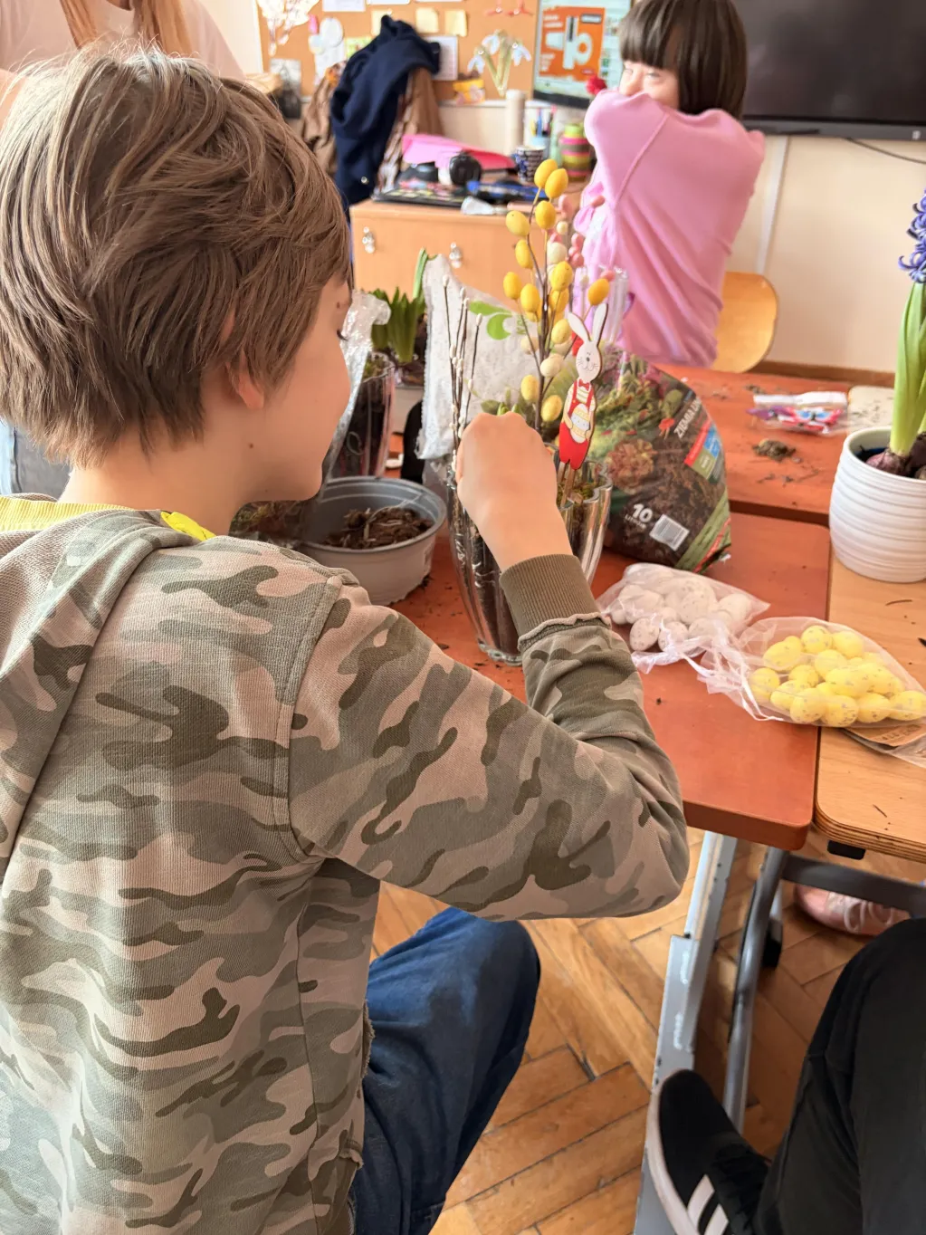 Obie klasy uczestniczyły również w warsztatach tworzenia stroików wielkanocnych, zorganizowanych przez wychowawców. Celem zajęć było zarówno pielęgnowanie tradycji, jak i rozwijanie kreatywności oraz integracji między uczniami. Dzieci z zaangażowaniem tworzyły świąteczne kompozycje, wykorzystując różnorodne materiały. Efekty ich pracy okazały się niezwykle pomysłowe, a wykonane stroiki z pewnością staną się piękną ozdobą wielkanocnych stołów.