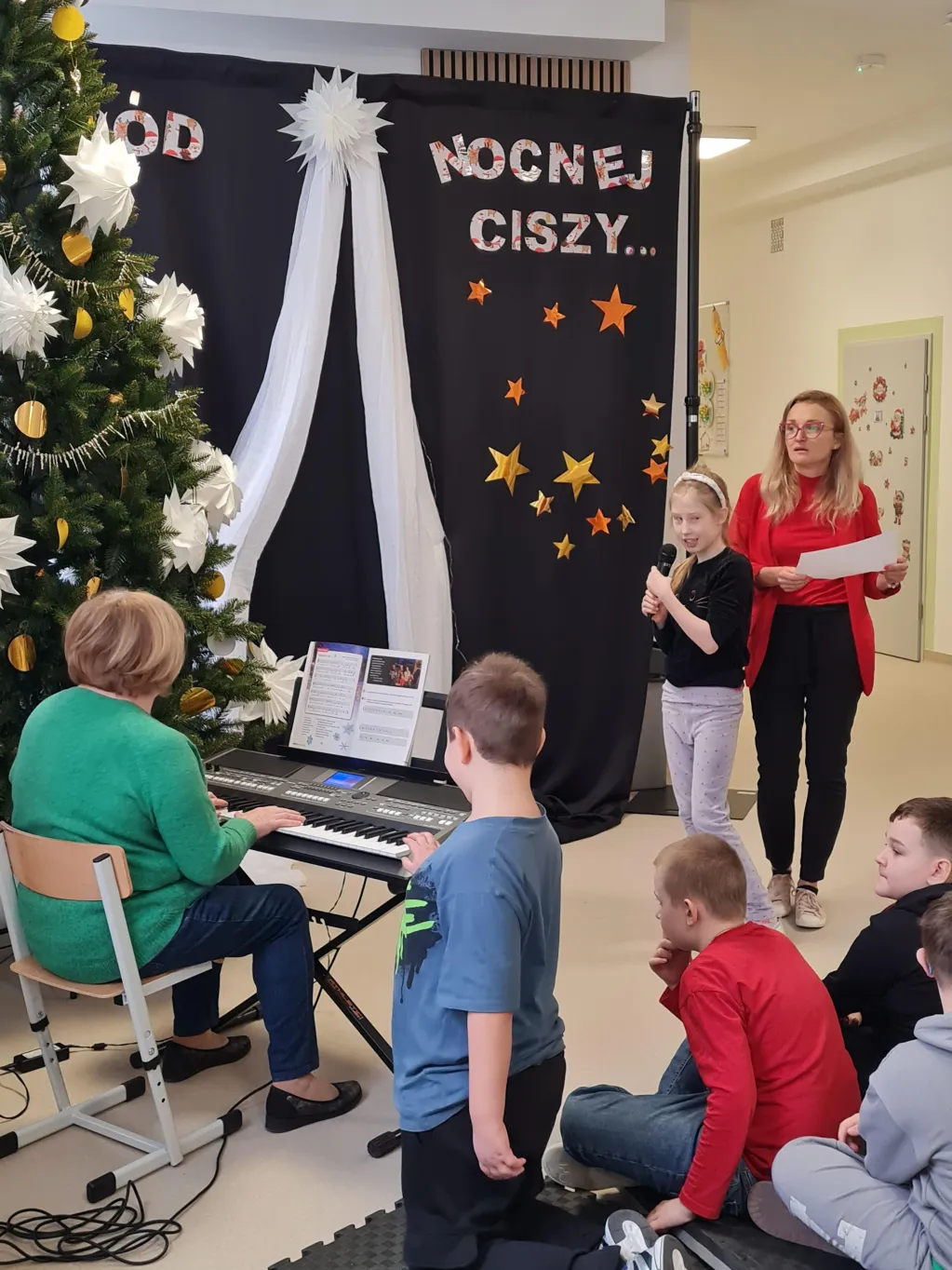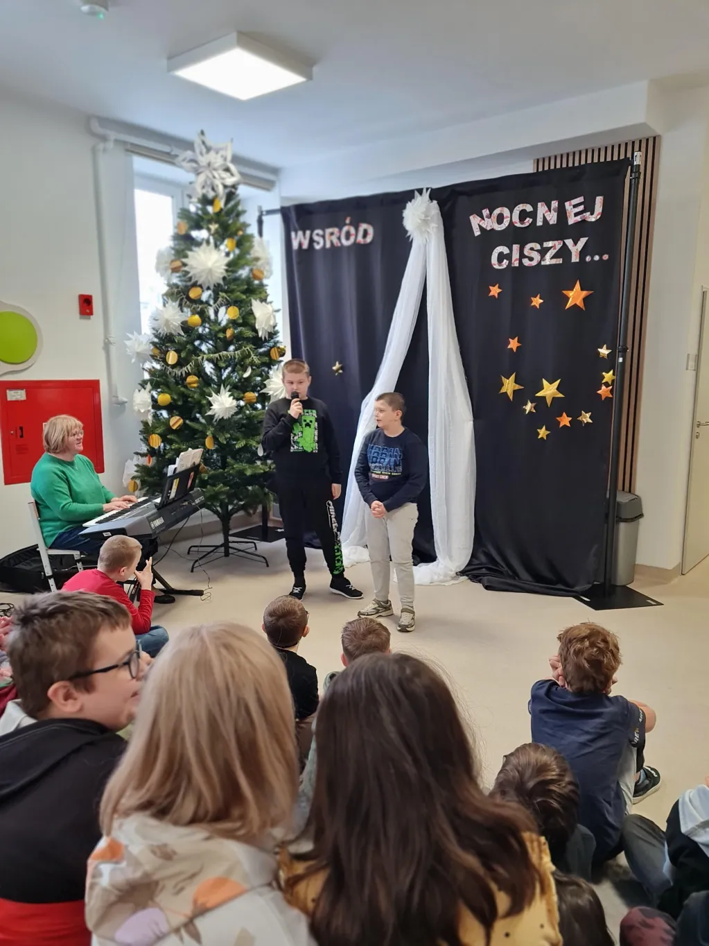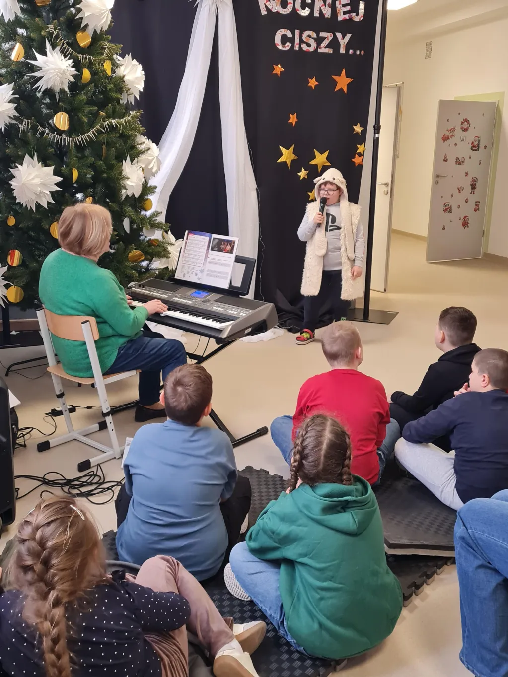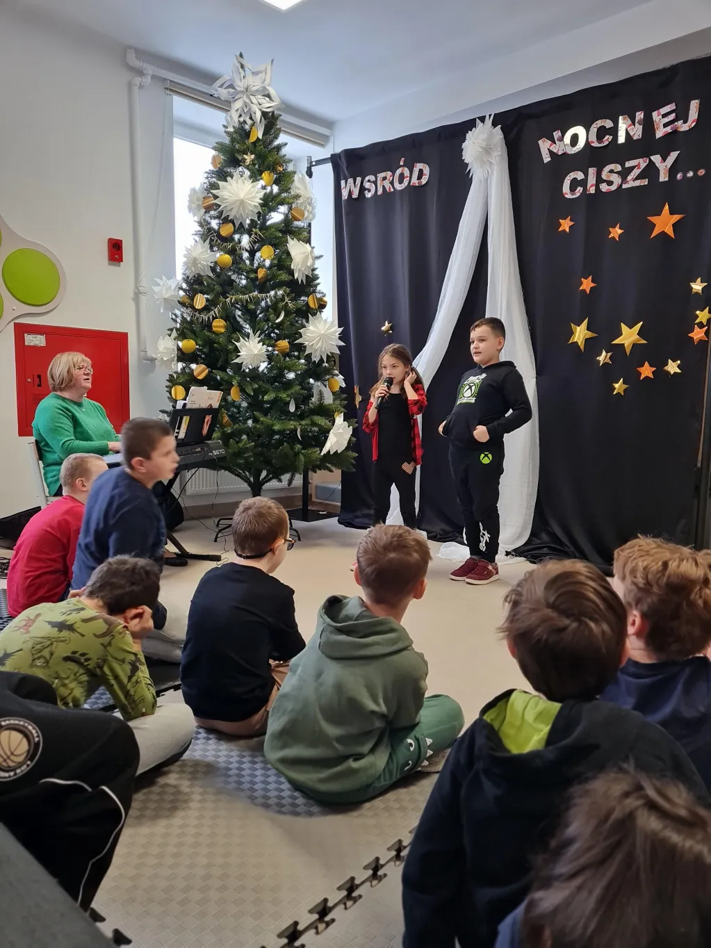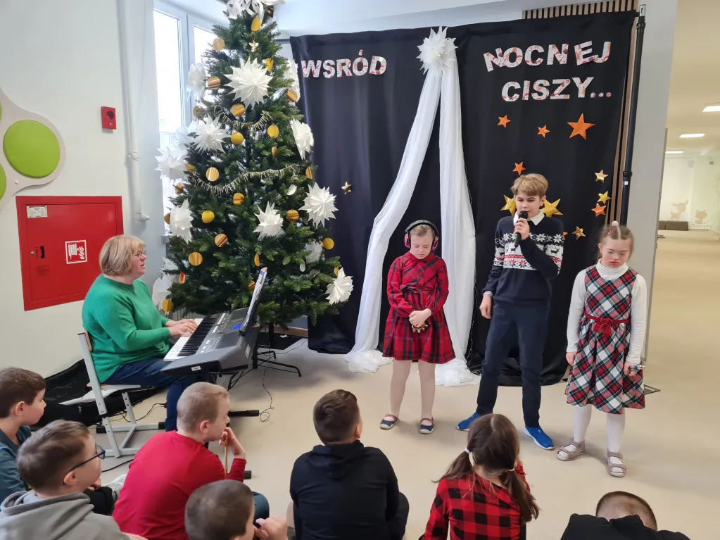 Choć świąteczny czas już za nami, uczniowie klas 1–3 przygotowali piękny, pełen ciepła występ, podczas którego zaprezentowali kolędy i pastorałki. Występ był niezwykłą okazję do wspólnego przeżycia jeszcze odrobiny świątecznej atmosfery. Dzieci śpiewały przy akompaniamencie muzycznym, poprowadzonym przez Panią Krystynę Skadorwę, która czuwała nad przygotowaniem młodych artystów.