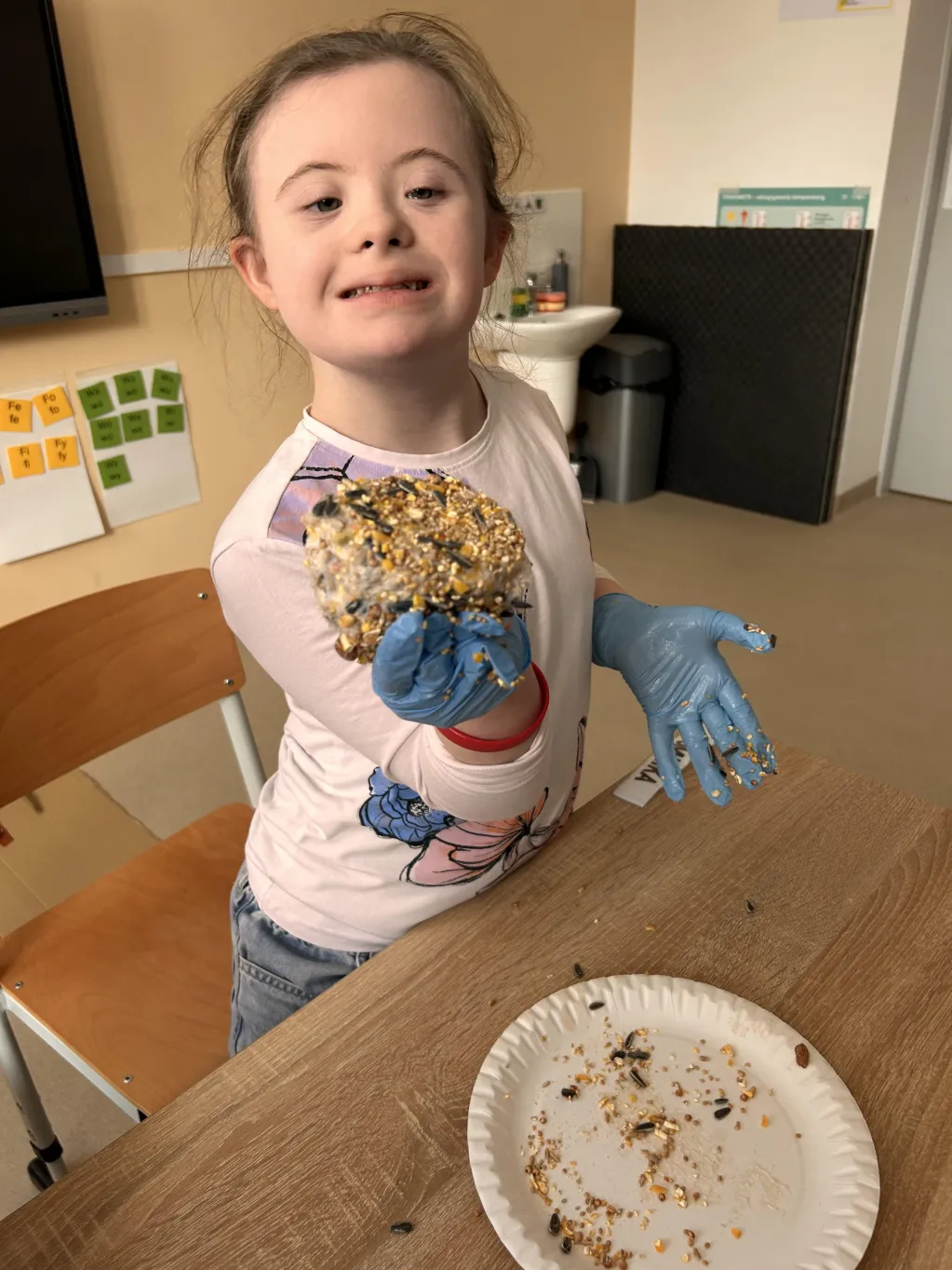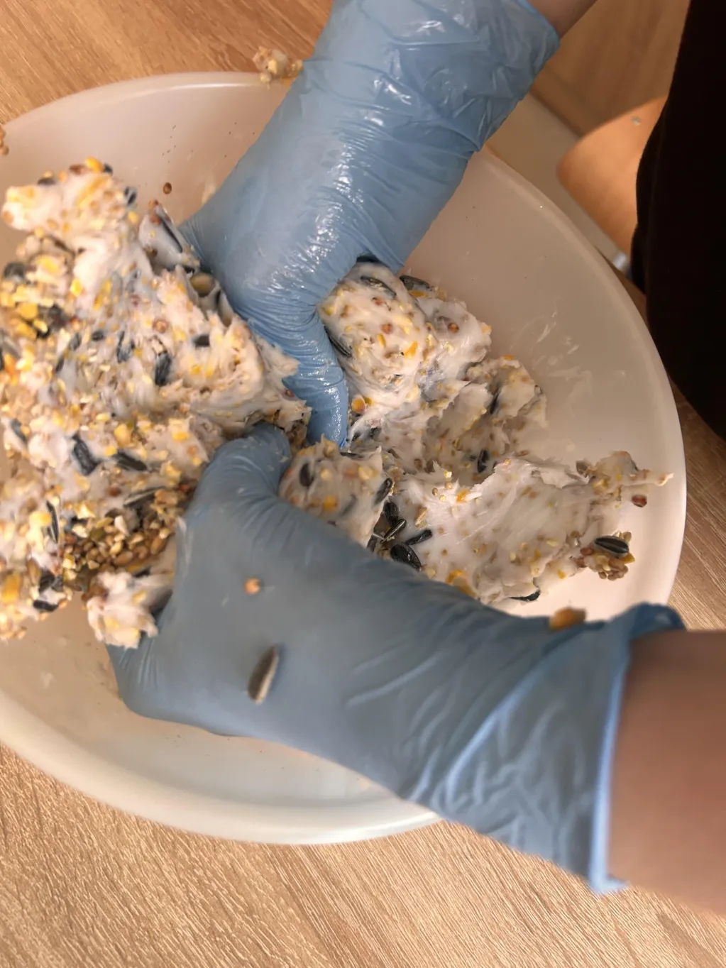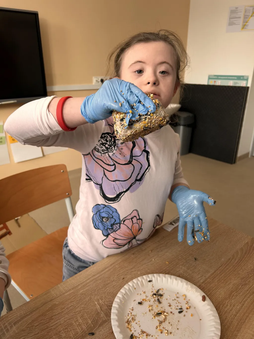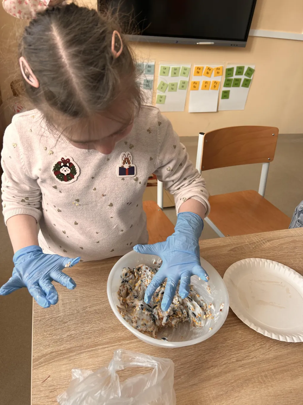 Podczas zajęć uczniowie dowiedzieli się, dlaczego zimą ptakom trudniej znaleźć pokarm, jak ważna jest pomoc ludzi oraz jakie produkty są dla nich bezpieczne. Dzieci wykazały się dużą samodzielnością, a jednocześnie empatią wobec zwierząt — z dumą tworzyły kule, wiedząc, że dzięki temu ptaki łatwiej przetrwają chłodne dni.