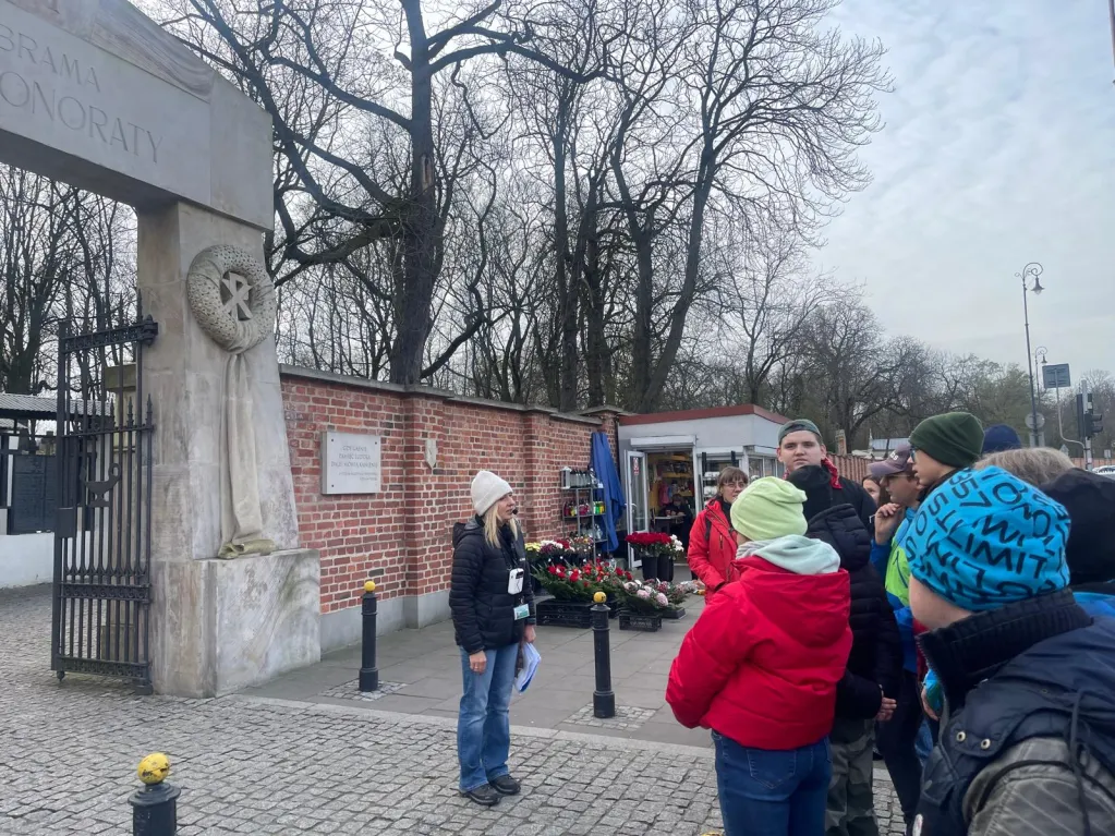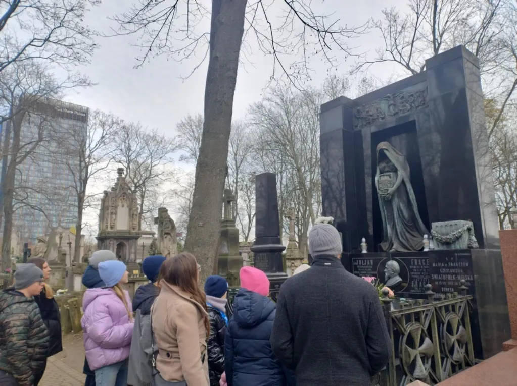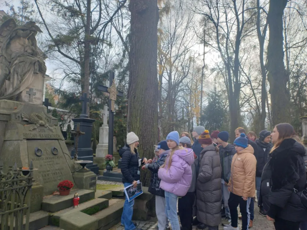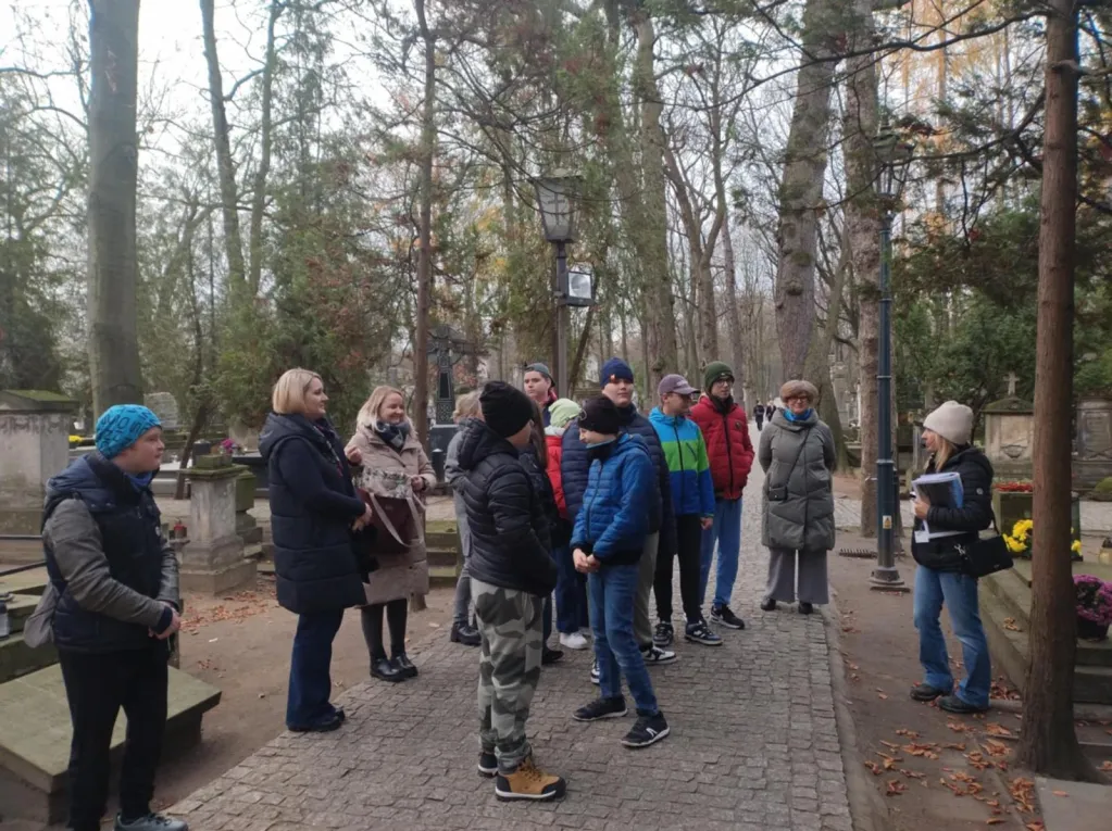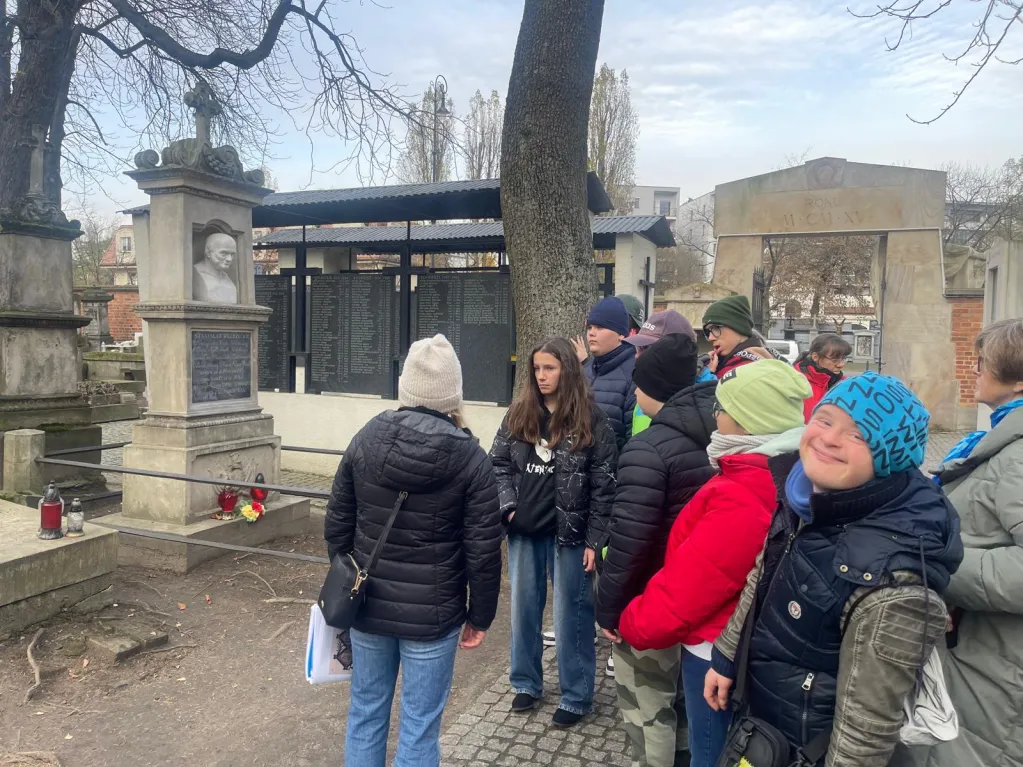 Dzięki staraniom pani Justyny Domańskiej uczniowie klas IV–VIII mieli możliwość uczestniczenia w zwiedzaniu Cmentarza Powązkowskiego z licencjonowanym przewodnikiem. W ramach wizyty uczniowie poznali historię tego wyjątkowego miejsca, sylwetki wybitnych postaci tam spoczywających oraz najważniejsze elementy dziedzictwa kulturowego związanego z zabytkowymi nagrobkami. Wydarzenie stanowiło cenną formę edukacji historycznej i kulturowej.