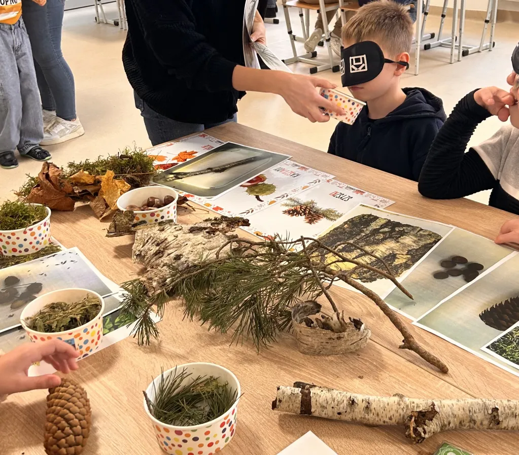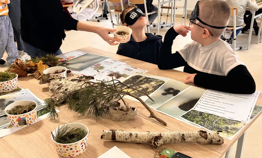 Leśne zapachy. Dzieci rozpoznawały zapachy leśnych darów. Leśne dary to złożona paleta aromatów, obejmująca świeże nuty igliwia (sosna, świerk), żywicy, mchu, ściółki oraz zapachy już ususzonych grzybów.