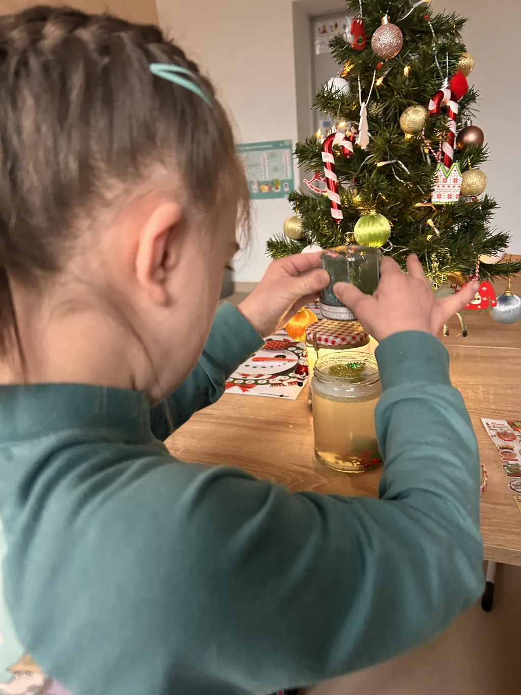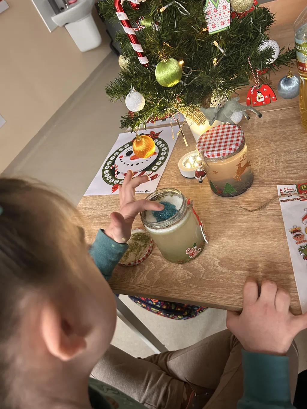 Słoiki sensoryczne. Uczniowie wykonali słoiki sensoryczne wypełnione brokatem i zimowymi akcentami. Po wykonaniu zadania dzieci obserwowały co się w nich dzieje a pływające w wodzie elementy uspokajały i relaksowały. Tworzenie słoików według własnego pomysłu - o różnej tematyce, z dodatkami lub z połyskującymi elementami - rozwija kreatywność i wyobraźnię uczniów.