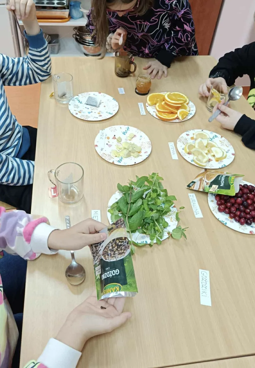 Zimowa herbatka. Dzieci poznawały produkty względem zapachu, smaku i zastosowania. Nauczyły się również jak przygotować smaczną i aromatyczną herbatę.