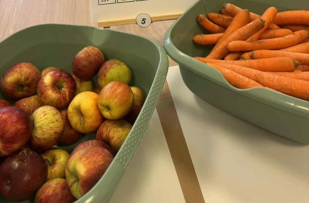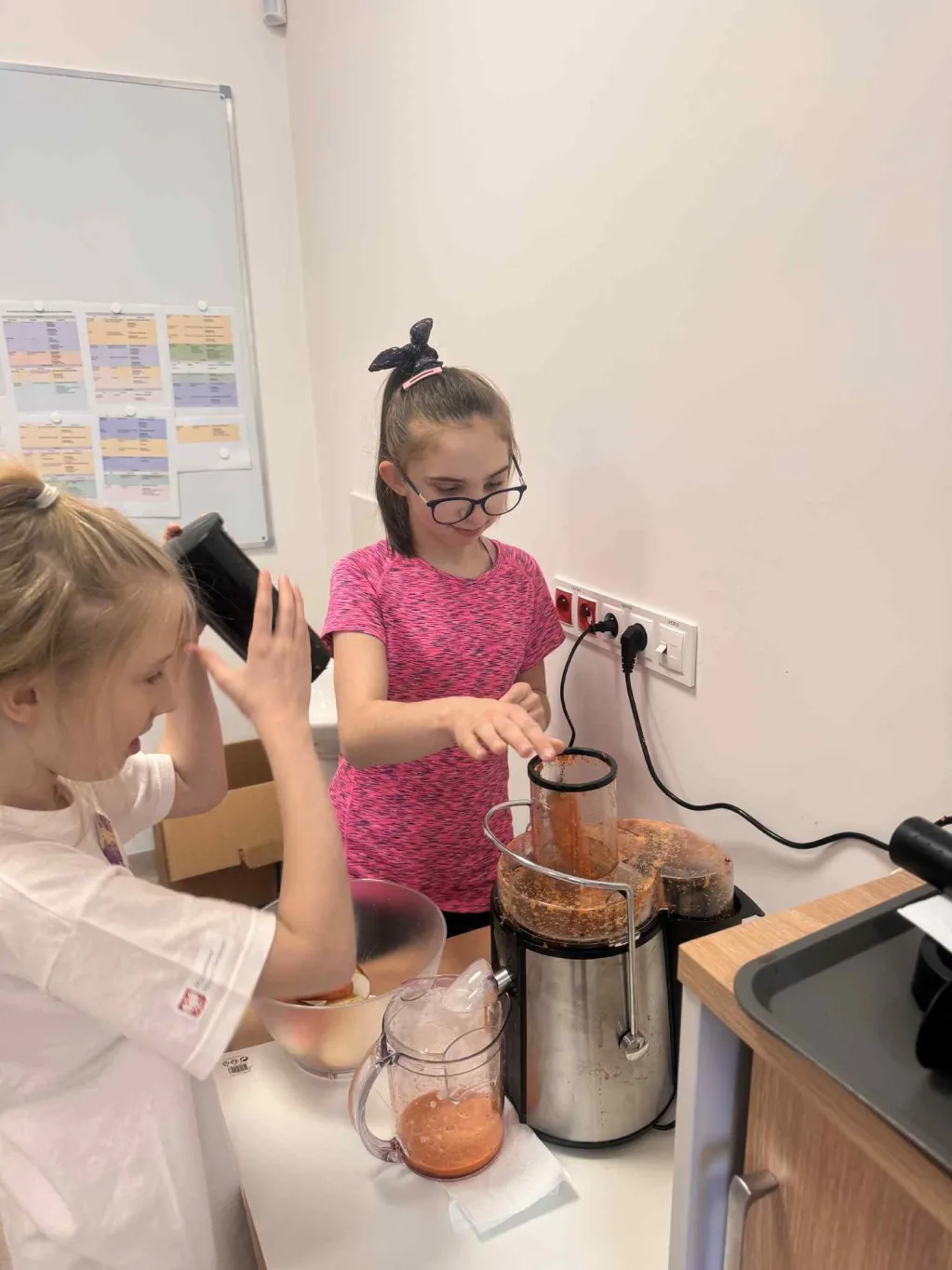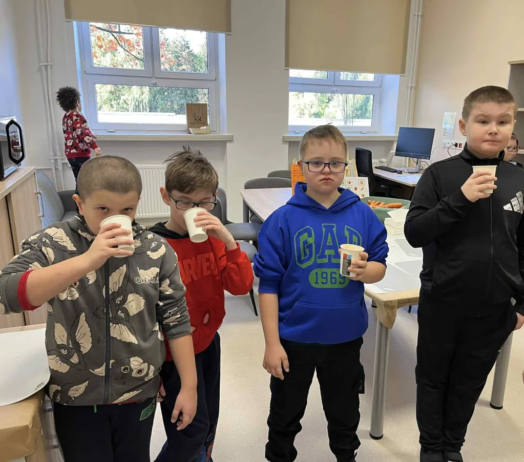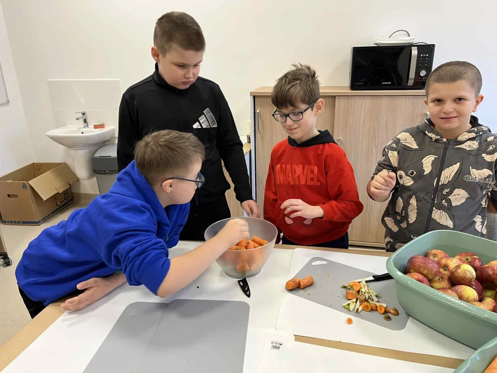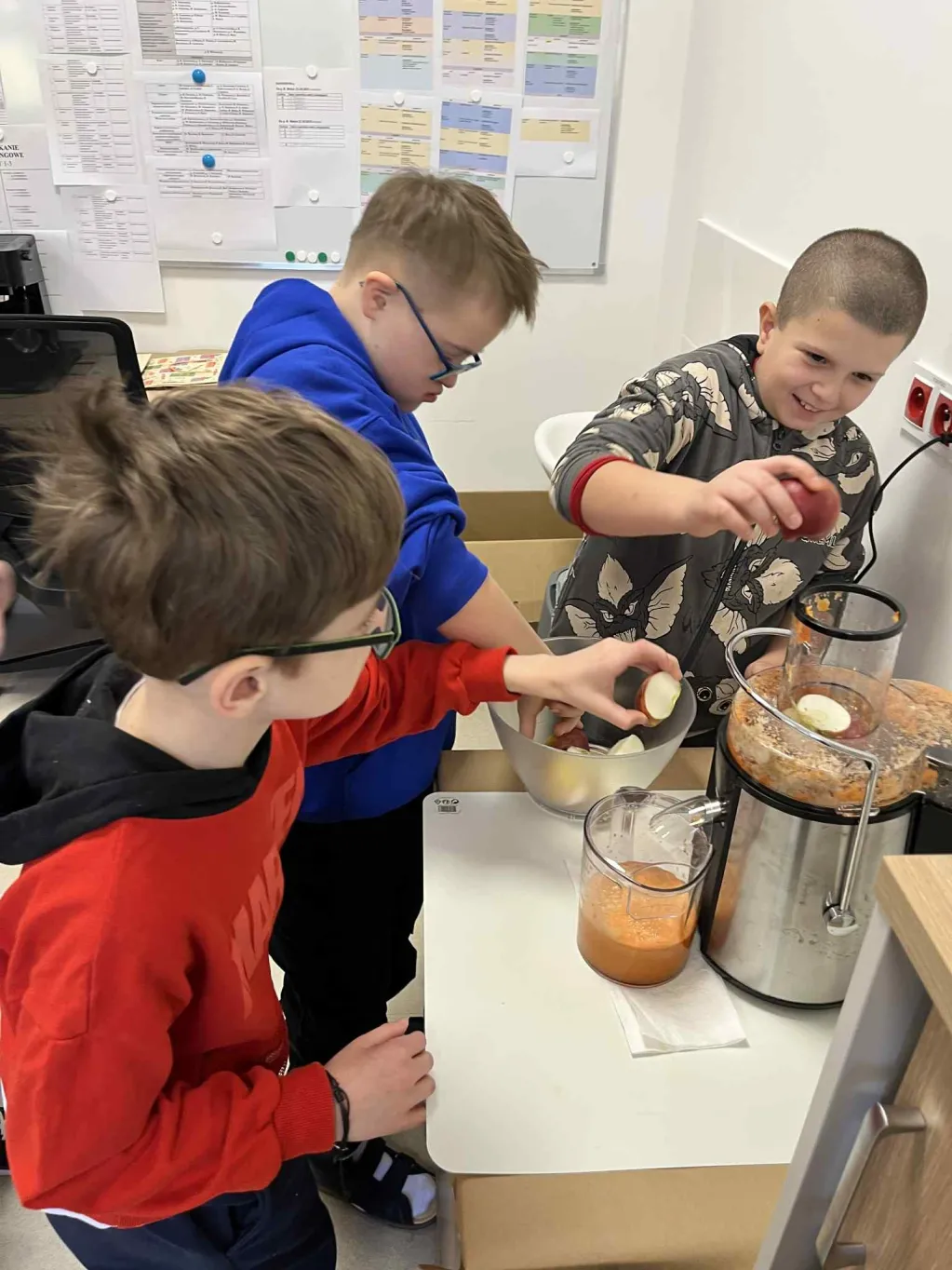 20 października obchodziliśmy w naszej szkole Światowy Dzień Warzyw i Owoców. Z tej okazji Samorząd Uczniowski przygotował dla uczniów klas 1-3 niespodziankę. W pokoju nauczycielskim czekało na dzieci stanowisko z gotową do pracy sokowirówką oraz misy z jabłkami i marchewkami. Dzieci mogły samodzielnie przygotować pyszny, pełen witamin sok. Wydarzenie miało na celu przypomnienie o kluczowej roli warzyw i owoców w zdrowej diecie i zachęcenie do ich spożywania każdego dnia.