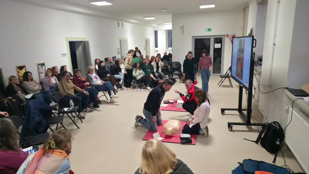 Na początku uczestnicy zostali wprowadzeni w podstawowe zagadnienia dotyczące bezpieczeństwa na miejscu zdarzenia. Prowadzący omówił, jak ocenić sytuację, jak sprawdzić reakcję osoby poszkodowanej oraz jak prawidłowo wezwać pomoc. Wyjaśniono również, jak rozpoznać nagłe zatrzymanie krążenia i dlaczego szybkie podjęcie czynności ratunkowych ma kluczowe znaczenie dla przeżycia poszkodowanego.