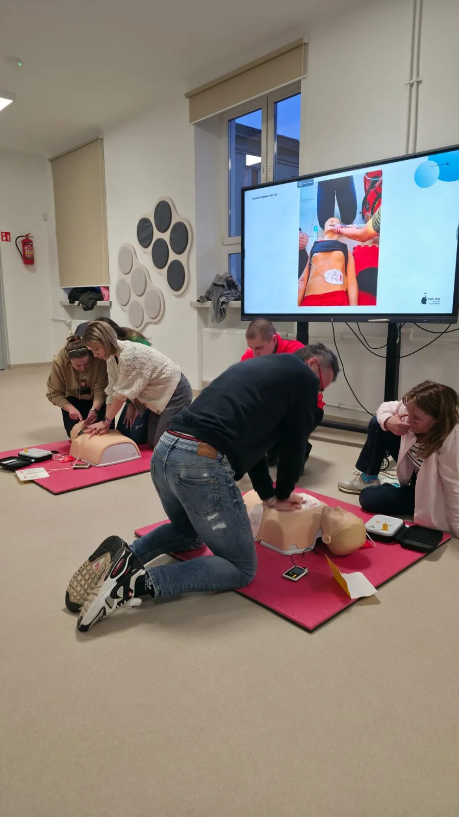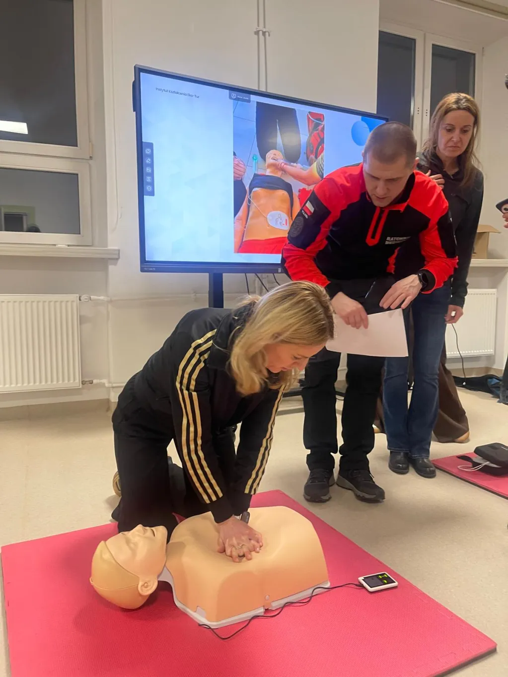 Po części wstępnej uczestnicy przystąpili do ćwiczeń praktycznych na fantomach. Instruktor dokładnie demonstrował technikę wykonywania ucisków klatki piersiowej, zwracając uwagę na tempo, głębokość oraz prawidłową pozycję rąk. Uczestnicy szkolenia mieli możliwość samodzielnego wielokrotnego przećwiczenia pełnej sekwencji RKO. Następnie przeprowadzono pokaz i ćwiczenia z użyciem AED. Prowadzący zaprezentował urządzenie, wyjaśnił jego działanie oraz omówił zasady bezpieczeństwa podczas defibrylacji. Uczestnicy uczyli się prawidłowego przyklejania elektrod, uruchamiania urządzenia oraz postępowania zgodnie z komunikatami głosowymi. W ramach symulacji uczestnicy mogli przećwiczyć pełną procedurę ratunkową: od oceny stanu poszkodowanego, poprzez RKO, aż po wykonanie defibrylacji.