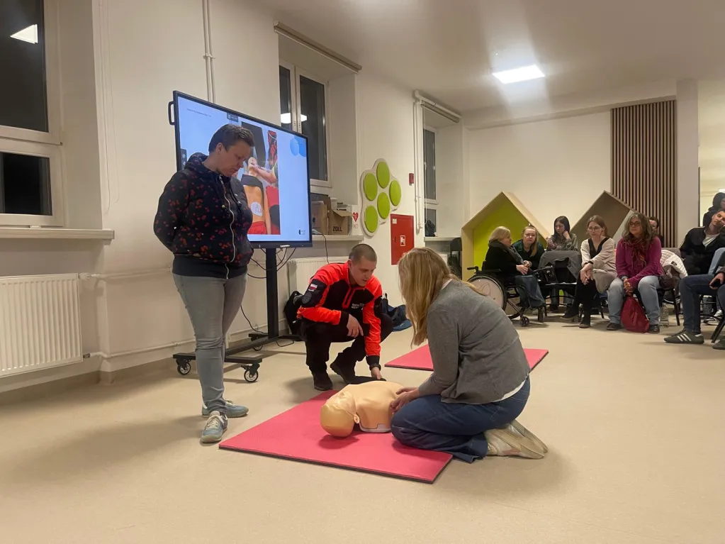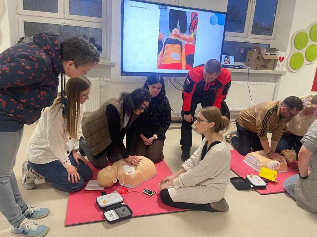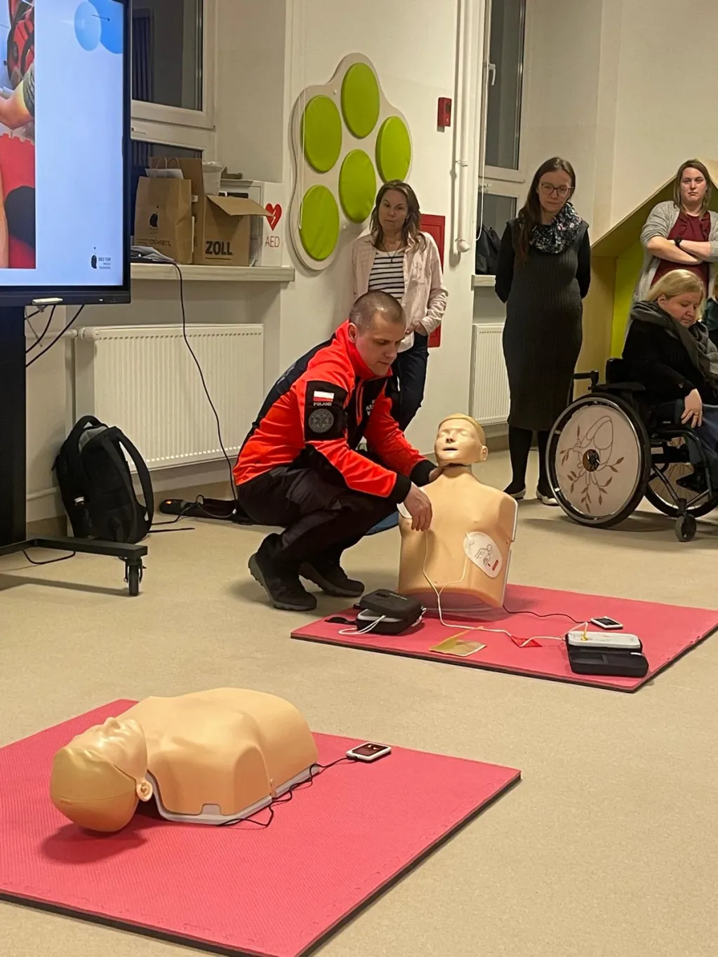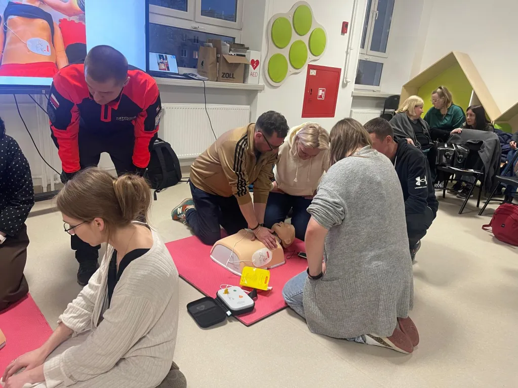 W dniu 17.03.2026 w naszej placówce odbyło się szkolenie z zakresu pierwszej pomocy, obejmujące zasady udzielania resuscytacji krążeniowo‑oddechowej oraz praktyczną obsługę automatycznego defibrylatora zewnętrznego (AED). Zajęcia poprowadził doświadczony ratownik medyczny, który w przystępny sposób połączył część teoretyczną z ćwiczeniami praktycznymi.