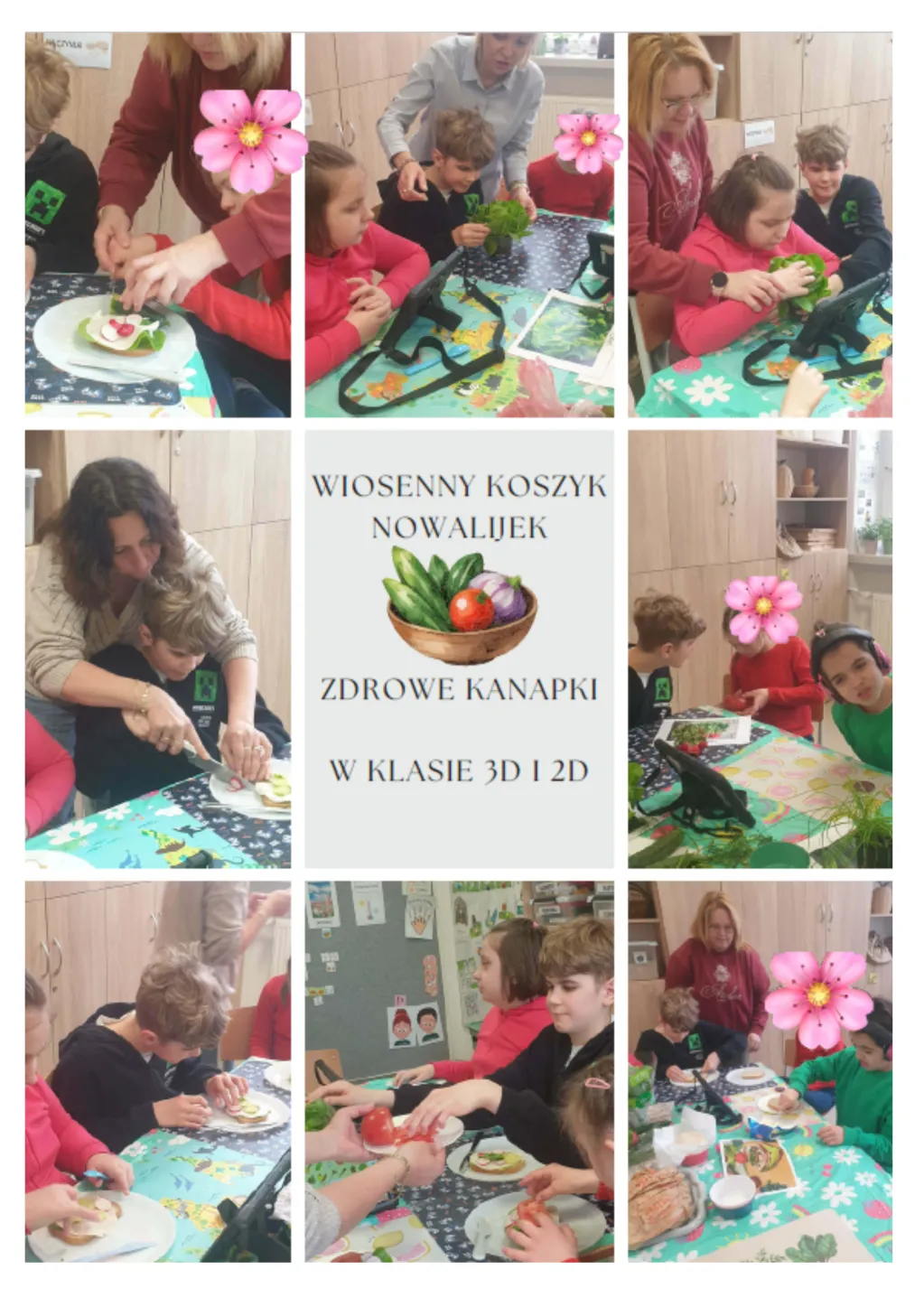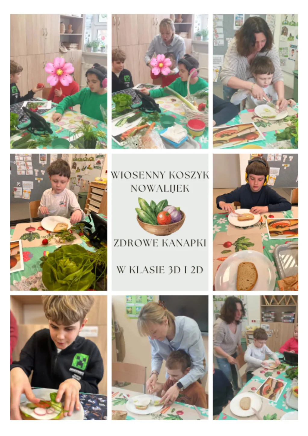 Kolejnym etapem zajęć było przygotowanie kanapek z przyniesionymi nowalijkami i produktami. Lekcje pokazowe to efektywna forma nauki przez zabawę i praktykę. Dzieci chętniej sięgają po warzywa, które same przygotowały. Zajęcia rozwijają samodzielność, kreatywność oraz budują trwałe nawyki żywieniowe.